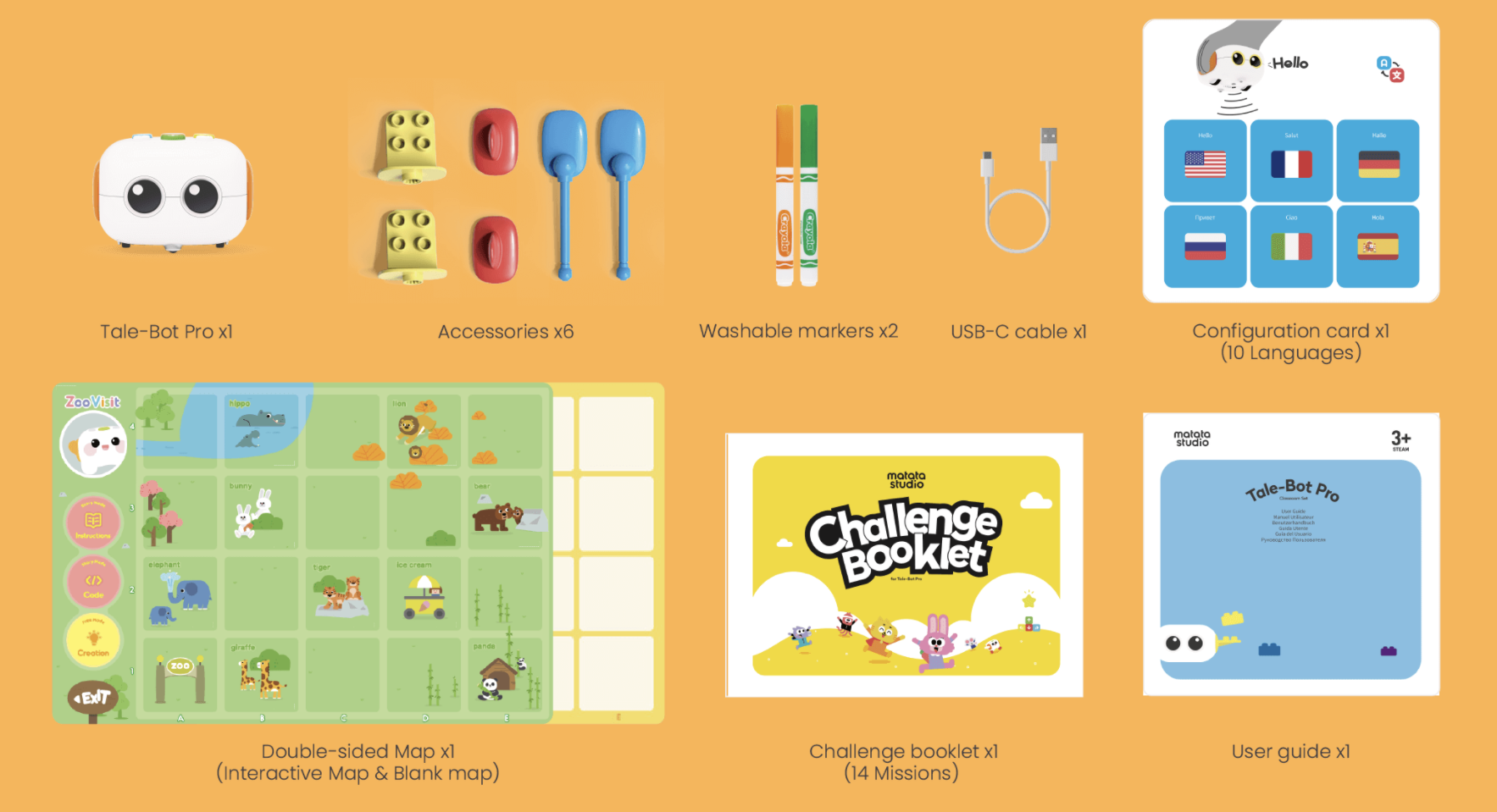 我們的平臺使用MatataStudio的Tale Bot Pro動手編碼集教育版。 Tale Bot Pro是一個可愛而聰明的機器人,可以走路、畫畫、唱歌、跳舞、說話和錄音!借助交互式地圖,機器人可以說10種語言,提供交互式學習環境,並帶來更多的編碼樂趣!